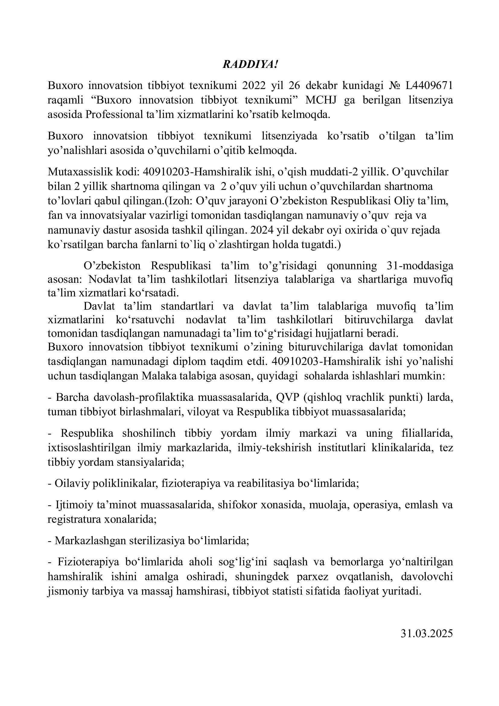 Buxoro Innovatsion tibbiyot texnikumida mavjud yo'nalishlar .